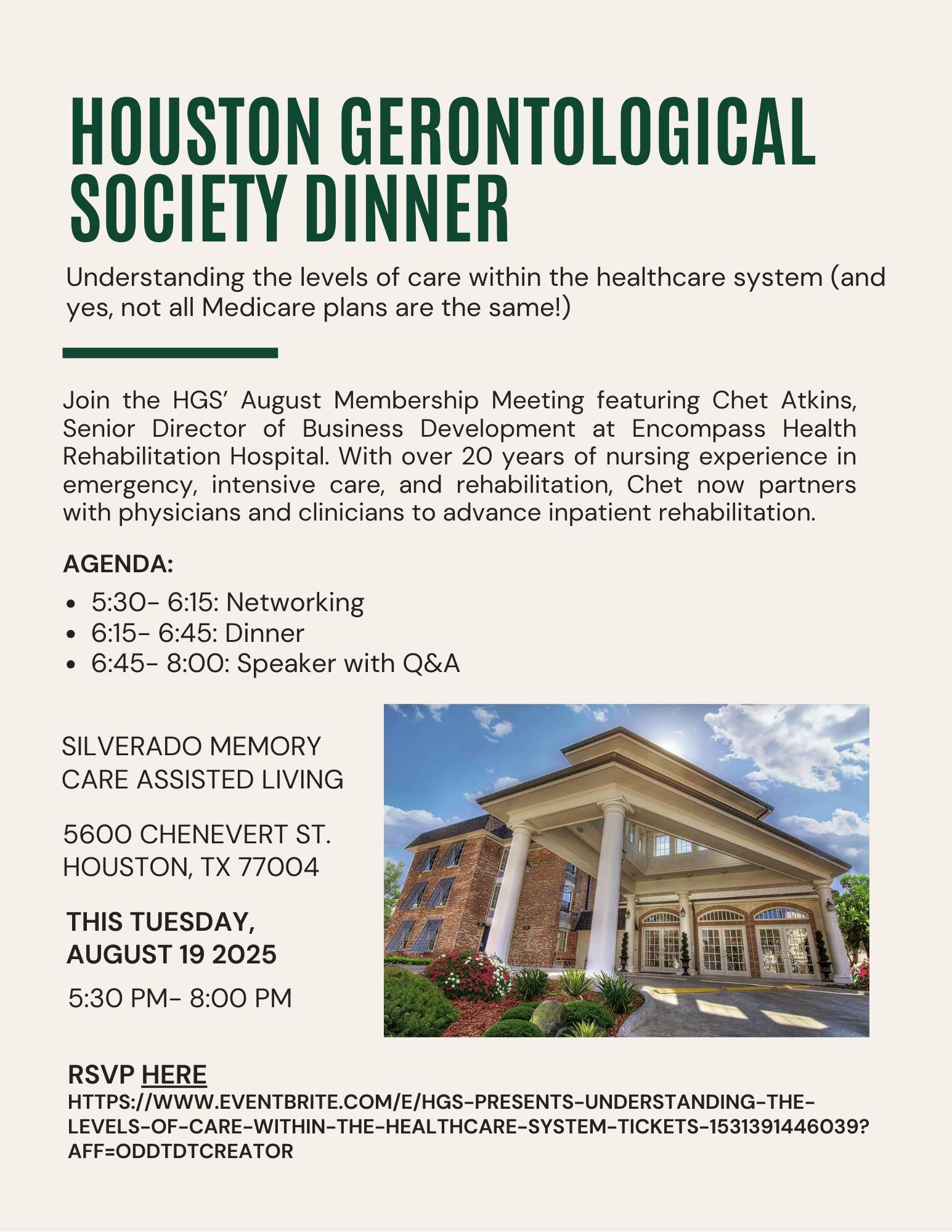 Join the HGS' August Membership Meeting featuring Chet Atkins, Senior Director of Business Development at Encompass Health Rehabilitation Hospital.